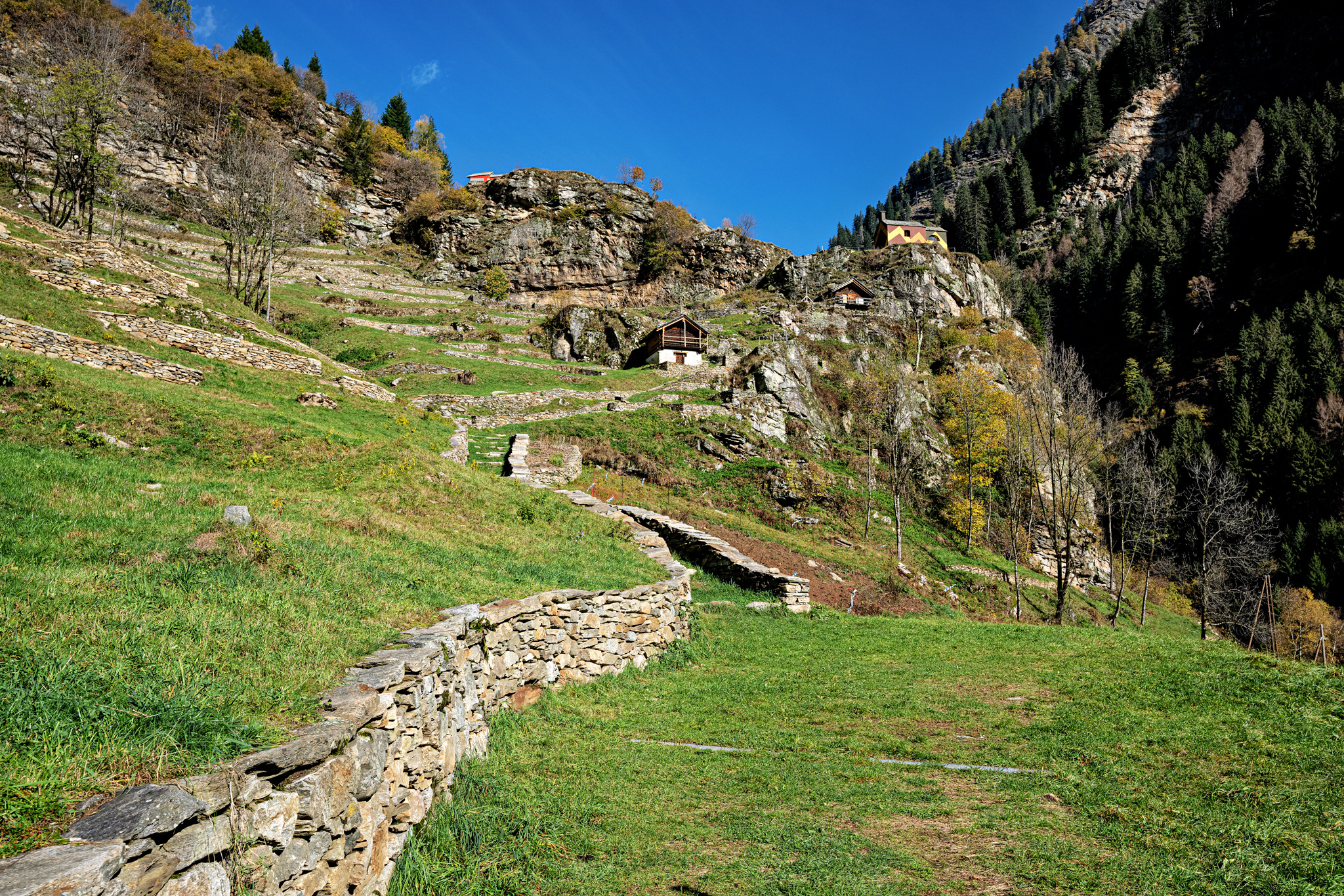 Der rund eineinhalbstündige Spaziergang führt von Rossa, dem nördlichsten Dorf des Calancatals zum Weiler Scata, welcher sich an einem sonnigen Südhang auf 1165 Meter befindet. Die erste vom anglo-schweizerischen Künstler David Tremlett bemalte Kapelle, steht direkt am Ortseingang von Rossa. Es ist die Kapelle San Carlo al Sabbione. Die Formen sind in Weinrot, Grau, Sandgelb oder Hellblau gehalten. Auffallend zwar, aber keineswegs schreiend, denn die bemalten Kapellen sollen zum Besuchen, zum Staunen und zum Nachdenken einladen.
