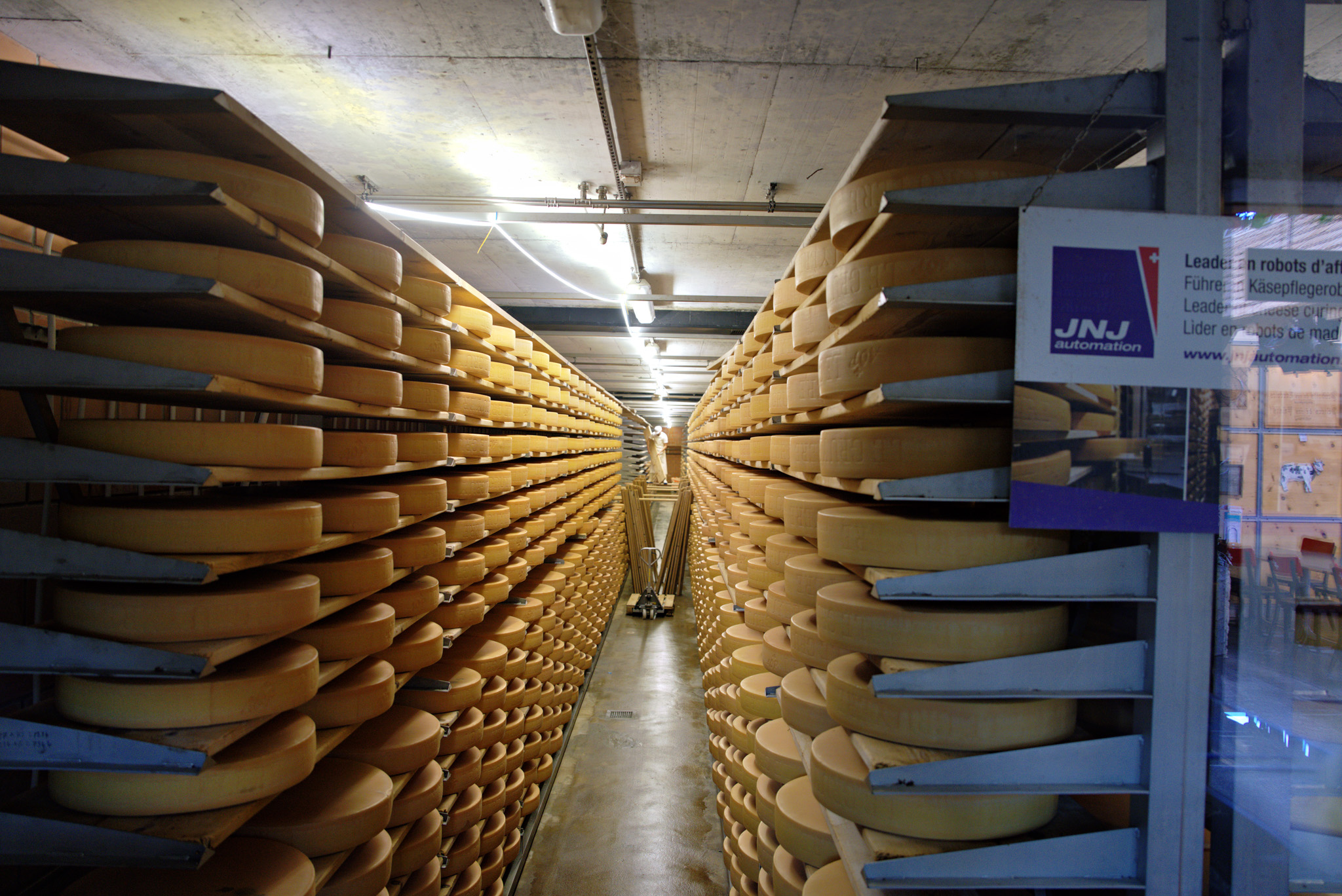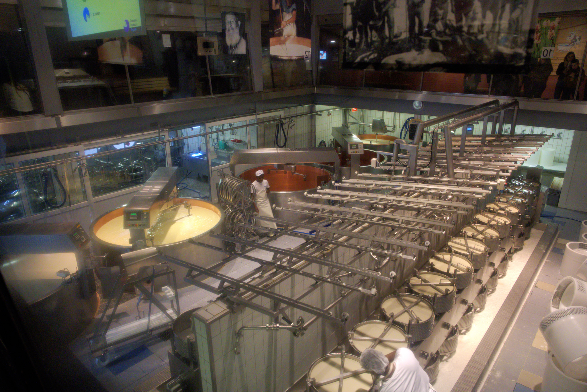 Von der Besucher-Galerie aus siehst du die Käser bei der Arbeit – die Produktion findet vormittags zwischen 9:00 und 12:30 Uhr statt, je nach Saison 2 bis 4 Mal pro Tag. Dazu gibt es eine Ausstellung, die den Käse, die Milchlieferung und die Traditionen der Region verständlich und sinnlich erklärt. Beeindruckend ist auch der Reifekeller, in dem rund 7’000 Laibe lagern können.